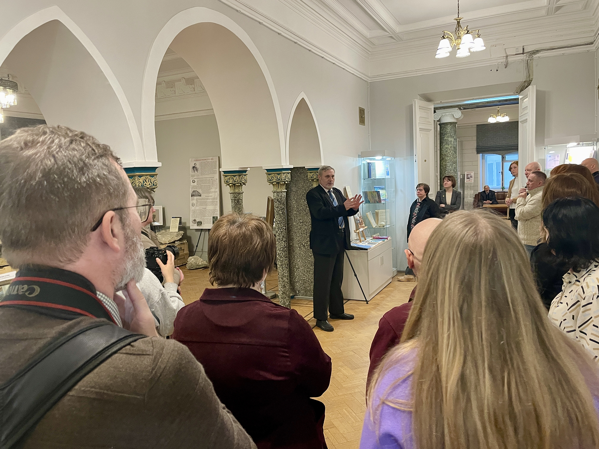 Продолжением знакомства с БЕН РАН стала экскурсия по выставке «Жизнь Земли в научной периодике», которую провел Иванова А.В. (к.г.-м.н., вед. н.с. Музея землеведения МГУ имени М.В. Ломоносова, с.н.с. Института географии РАН, руководитель экспедиции «Флотилия плавучих университетов»). Выставка посвящена 130-летию периодического издания «Землеведение», 65-летию сборника научных работ «Жизнь Земли» и 10-летию журнала «Жизнь Земли». На экспозиции были представлены не только уникальные книжные издания, но вещи академика В.И. Вернадского, натурные экспонаты, собранные в многочисленных экспедициях, художественные произведения и коллекции минералов и энтомофауны.